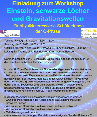 nnen des MINT-EC-Netzwerkes "Rhein-Main" in der E- und Q-Phase bietet die Heinrich-von-Kleist-Schule den Workshop "Einstein, Gravitationswellen und schwarze Löcher".